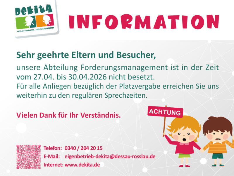 05 Dezember, 2025 AktuellesDer Eigenbetrieb DeKiTa ist ein Unternehmen der Stadt Dessau-Roßlau und hat in seiner Trägerschaft 22 Kindertageseinrichtungen, einen Jugendklub und das „Spielmobil“, verteilt auf das gesamte Stadtgebiet von Dessau-Roßlau und deren Vororte.