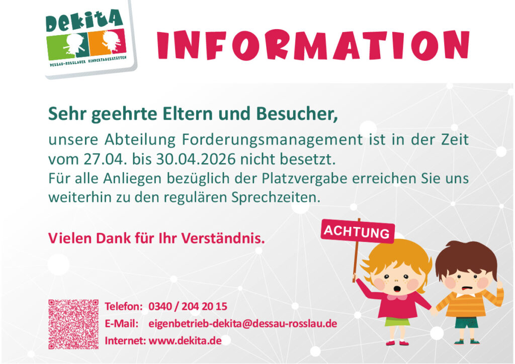 27 Apr. Elterninformation | Sprechzeiten Veröffentlicht 00:00h in Aktuelles, Elterninformation von Redaktion DeKiTa Elterninformation Suchbegriffe: DeKiTa, Dessau-Roßlau, Eigenbetrieb, Elterninformation, Schließzeiten Seite drucken
