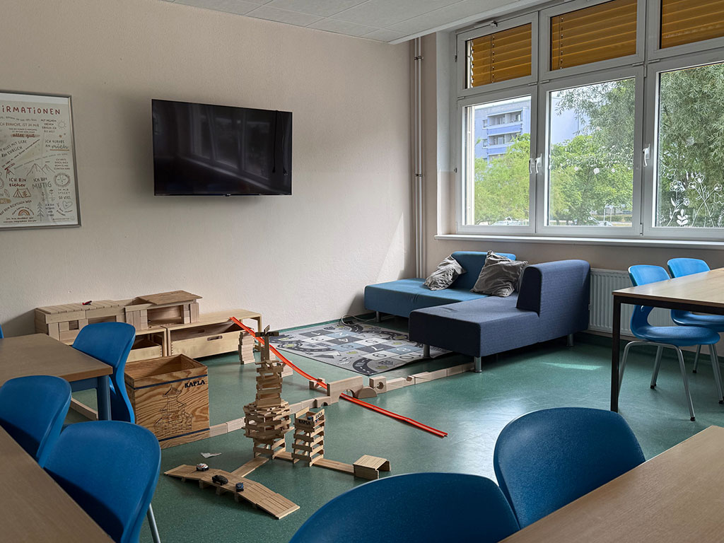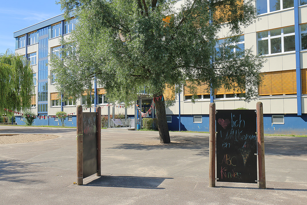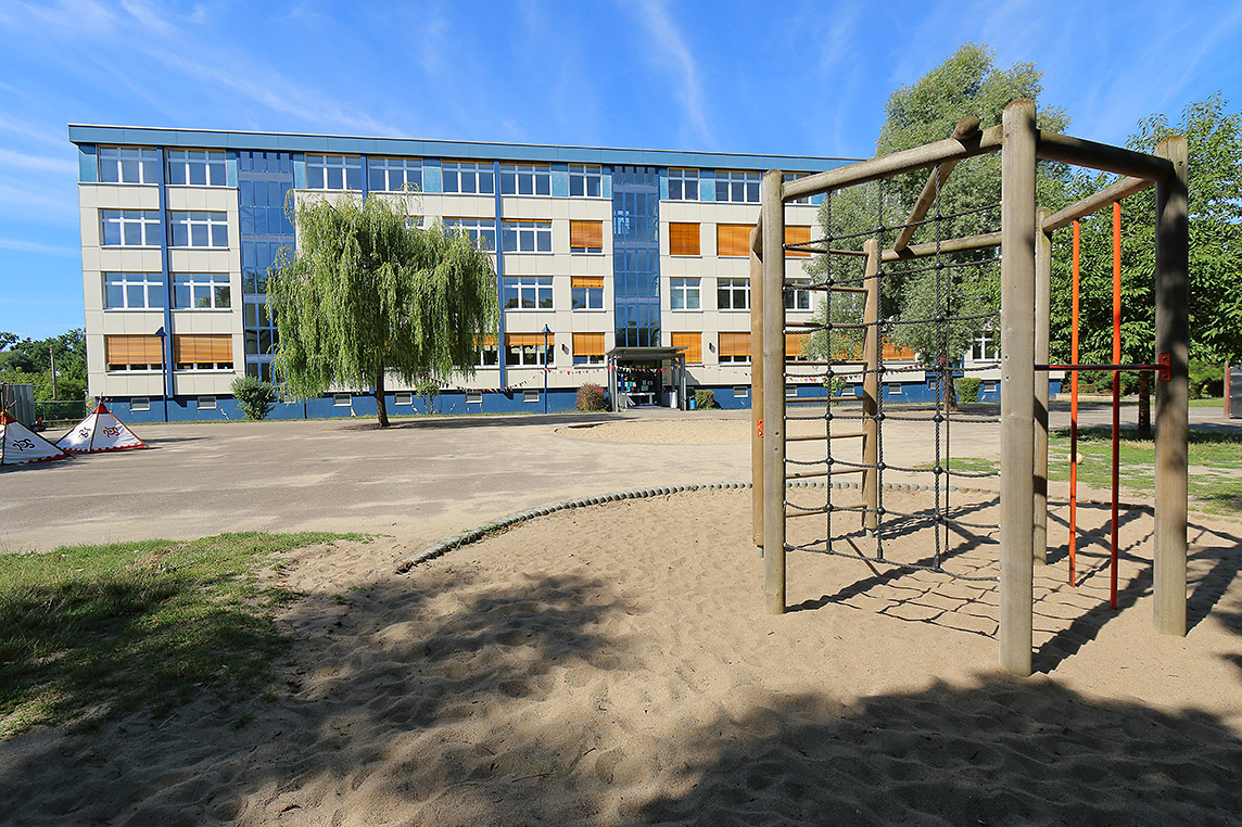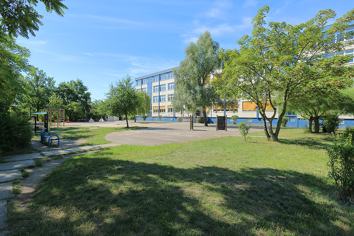 Unser Hort ist im Gebäude der Grundschule „Kreuzbergstraße“ integriert. Zu den fünf individuellen und themenbezogenen Horträumen und einer Kinderküche verfügen wir über zwei große Freiflächen, auf denen wir uns aktiv bewegen können. Zusätzlich steht uns ein kleiner Innenhof zur Verfügung, den wir individuell jährlich neu gestalten – beispielsweise durch selbsthergestellte Hochbeete, die wir mit Obst und Gemüse bepflanzen.