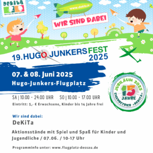 0 LikesUnsere Teilnahme am 19. Hugo-Junkers-Fest Wir begrüßen Sie am Samstag, den 7. Juni 2025, in der Zeit von 10:00 – 18:00 Uhr, an unseren Aktionsständen mit Spiel und Spaß für alle Kinder und Jugendliche. Besuchen Sie auch unseren Infostand. Wir freue...
