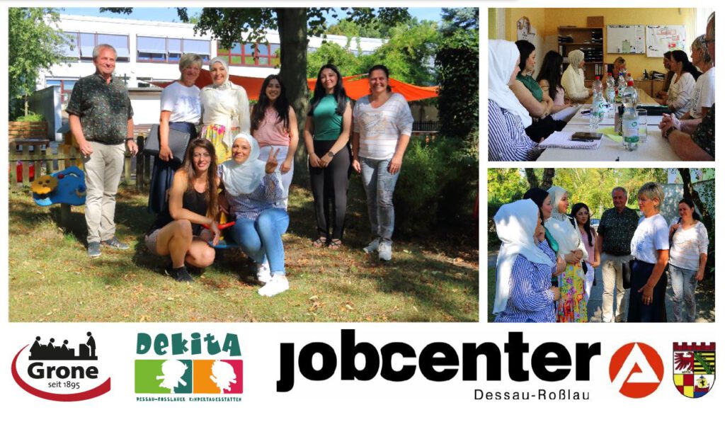 Im Rahmen eines offenen Pressegespräches, am Vormittag des 11. September 2023 in der Kita „Kinderland“, trafen sich vier syrische Absolventinnen des Berufsabschlussjahrganges 2023 mit Frau Ines Blaschczok, Geschäftsführerin des Jobcenters Dessau-Roßlau, Frau Doreen Rach, Betriebsleiterin des Eigenbetriebes DeKiTa, Herrn Uwe Menzel, Projektleiter des Grone Bildungszentrums Dessau-Roßlau und Frau Julia Maynicke, die Leiterin der Kindertagesstätte „Kinderland“ als Vertreterin einer der bestehenden DeKiTa-Ausbildungsstätten, zu einem gemeinsamen Erfahrungsrückblick.Hier wurden seitens der Absolventinnen persönliche Betrachtungen in Bezug auf bestehende Alltagshürden geschildert und sowohl positive als auch kritische Aspekte zum Verlauf ihrer vergangenen Ausbildungszeit angesprochen.